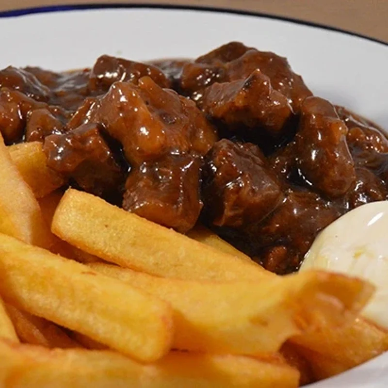 Heerlijk vers stoofvlees, mals en sappig, geserveerd met goudbruine, knapperige frietjes.